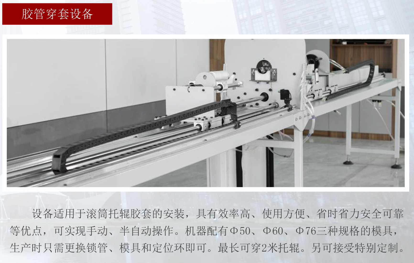 滾筒穿管機(jī)是由我司自主研發(fā),適用于滾筒托棍、膠套的安裝,具有效率高、使用方便、省時(shí)省力安全可靠等優(yōu)點(diǎn),可實(shí)現(xiàn)手動(dòng)、半自動(dòng)操作。