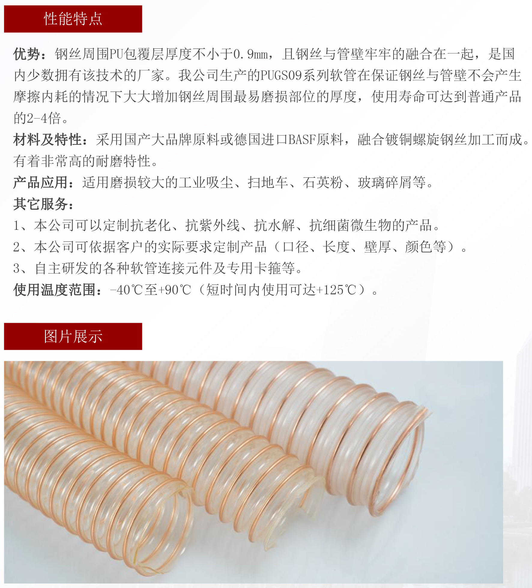 材料特性:德國進口BASF原料,融合鍍銅螺旋鋼絲加工而成,有著非常高的耐磨特性。產(chǎn)品應用:適用磨損較大的工業(yè)吸塵、掃地車、石英粉、玻璃碎屑等。