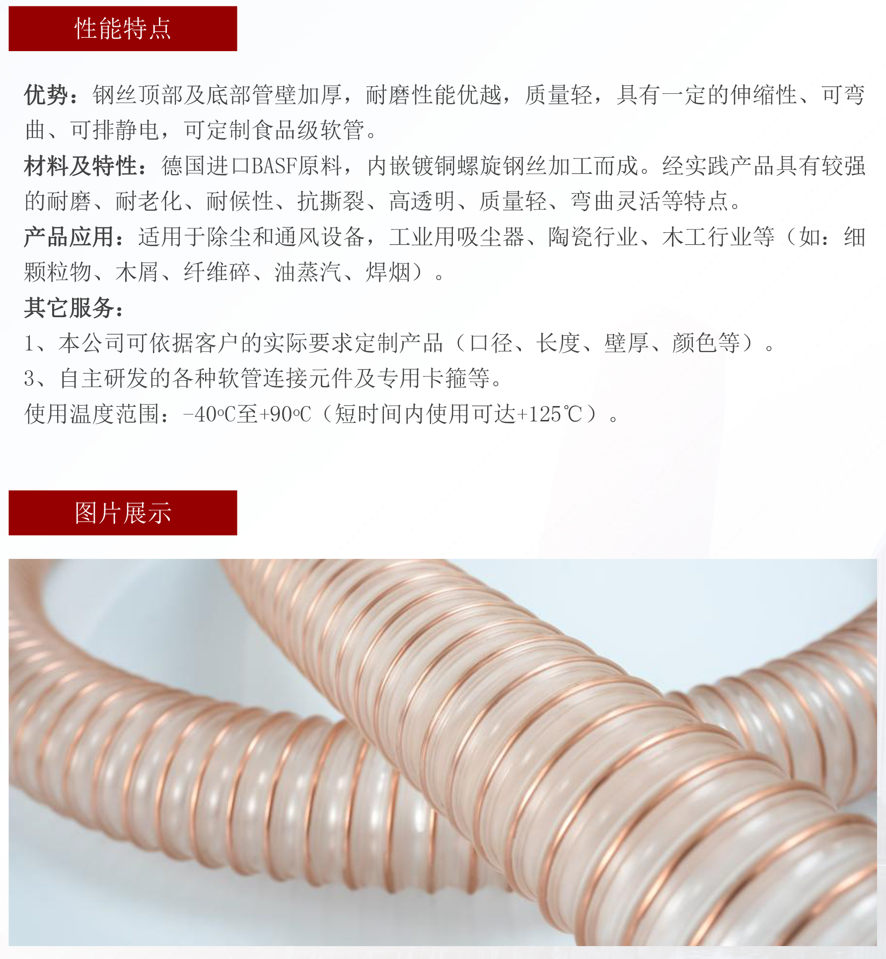 材料特性:優(yōu)質(zhì)聚氨酯原料,內(nèi)嵌銅鋼絲加工而成,耐磨性能優(yōu)越,可達PVC軟管的5-10倍。產(chǎn)品應用:適用空間狹小或活動頻繁的工業(yè)除塵設備、通風設備等。如:粉塵、木屑、纖維碎屑、油蒸汽、焊煙等。