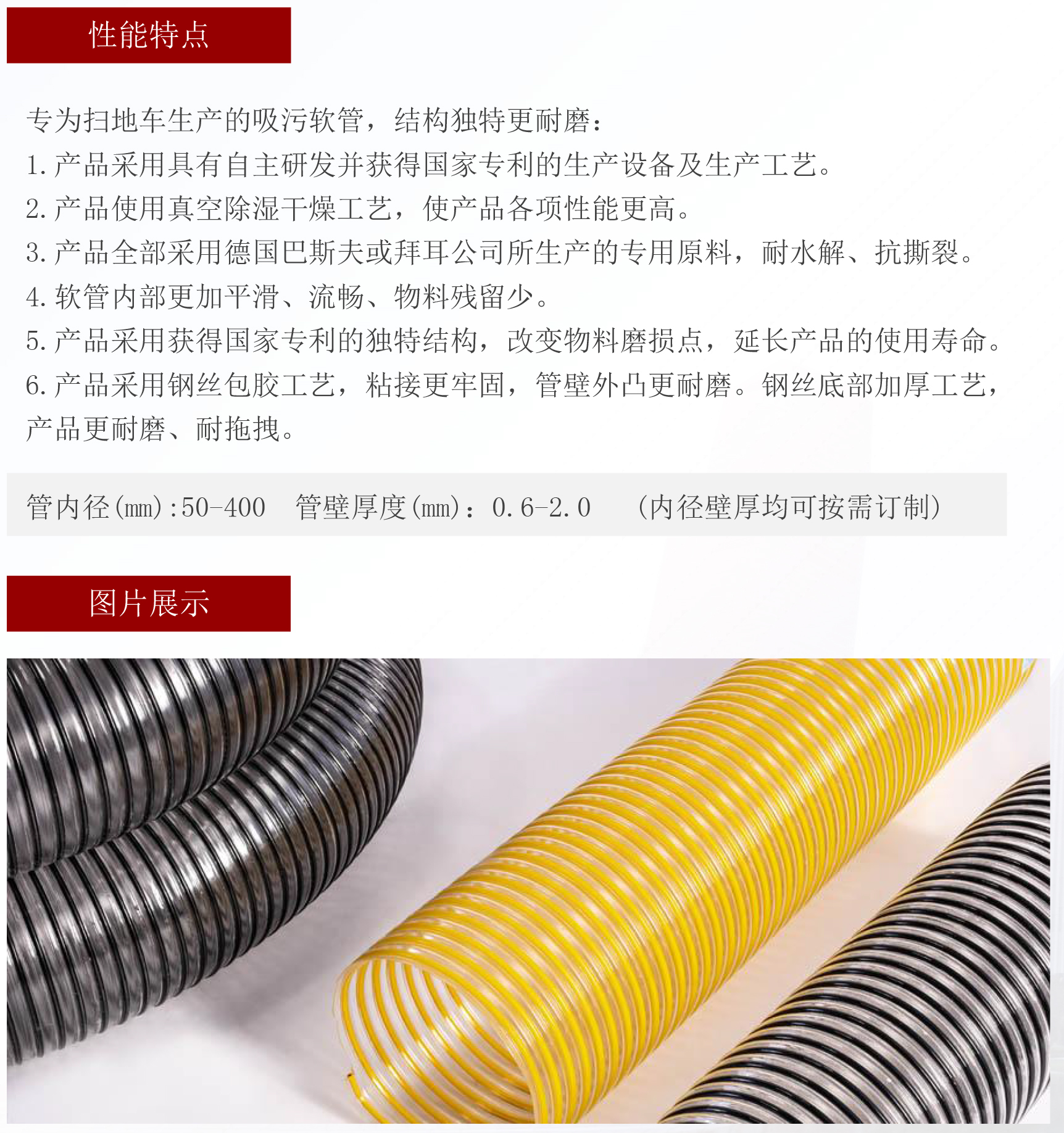 采用進口原料生產(chǎn),獨特的鋼絲包膠工藝,粘接更牢固,管壁外凸更耐磨。鋼絲底部加厚工藝,產(chǎn)品更耐磨、耐拖拽。