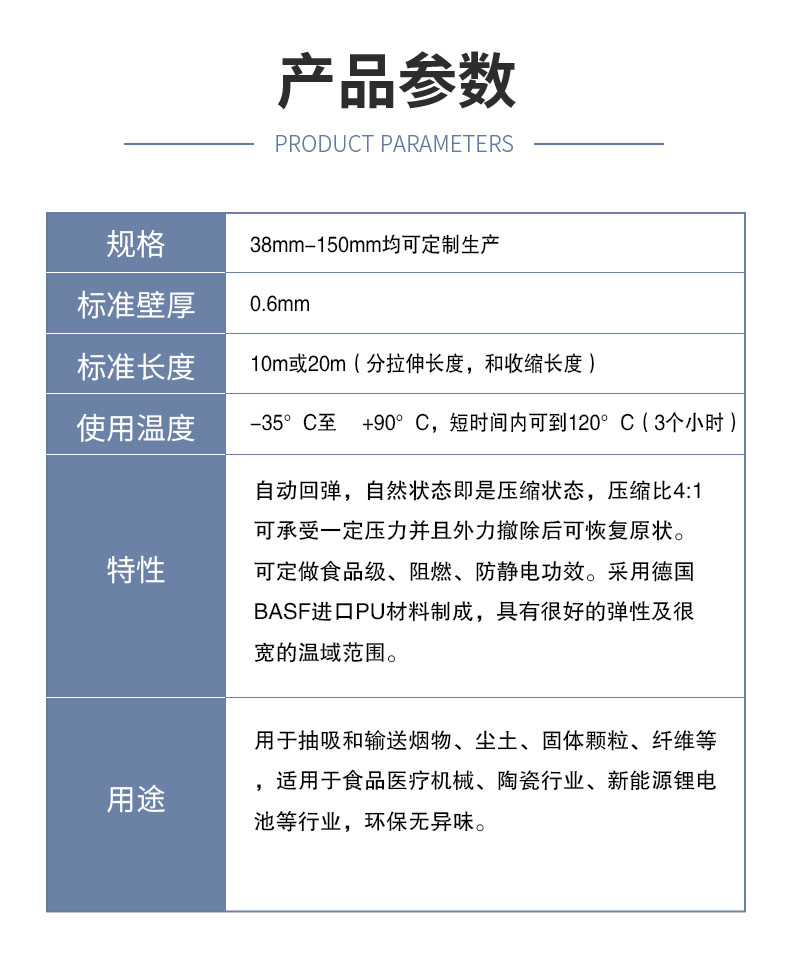 采用德國巴斯夫或拜耳公司所生產的專用原料,具有抗拉伸、張力強、撕裂強度高、耐磨損耐折曲、耐穿透、耐高低溫、耐水解等性能并具有很好的回彈性且使用壽命長!