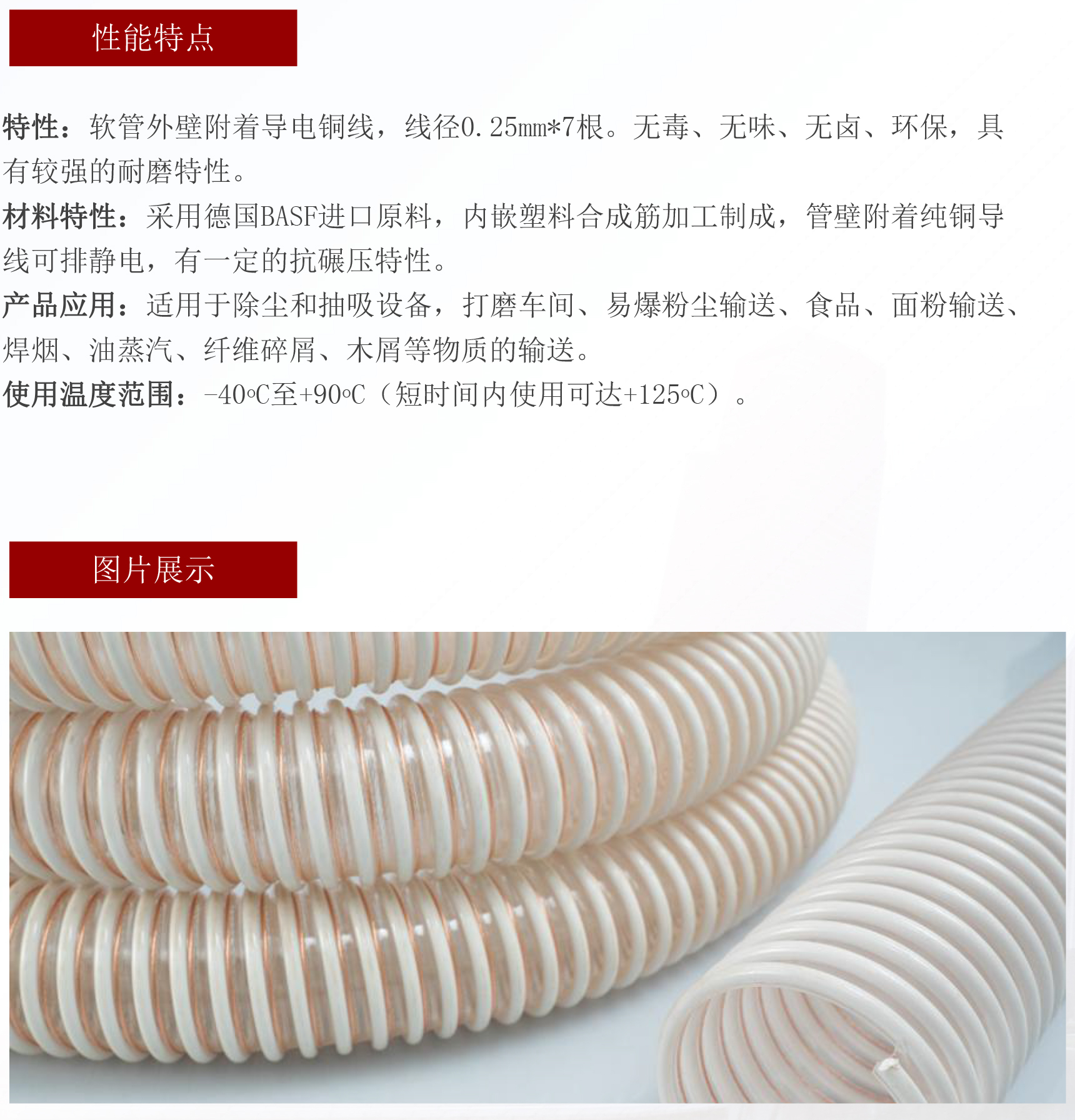 材料特性:采用德國(guó)BASF原料,內(nèi)嵌塑料合成筋加工制成,管壁附著純銅導(dǎo)線可排靜電,具有一定的抗碾壓特性。產(chǎn)品應(yīng)用:適用于除塵和抽吸設(shè)備,打磨車間、易爆粉塵輸送、 食品、面粉輸送、焊煙、油蒸汽、纖維碎屑、木屑等物質(zhì)的輸送。