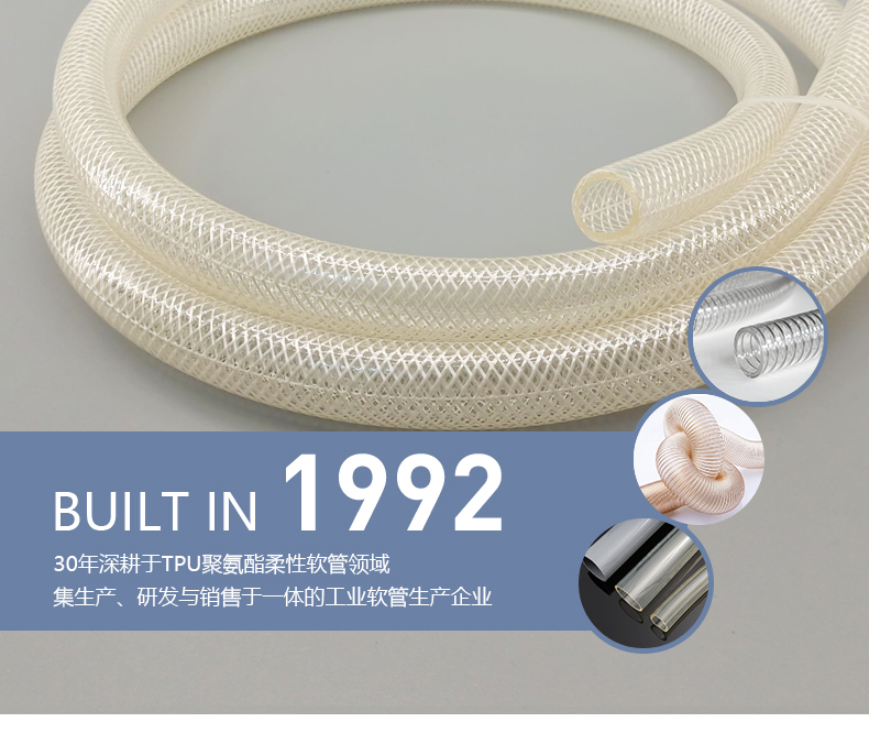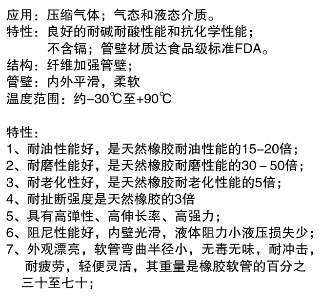 采用TPU材料生產的軟管具有抗拉伸、張力強、撕裂強度高、耐磨損、耐折曲、耐穿透、耐低溫、耐水解等性能,并具有很好的回彈性且使用壽命長。本品不含增塑劑,無毒無味,是一種高性能環(huán)保型軟管。是PVC、橡膠軟管的替代產品。