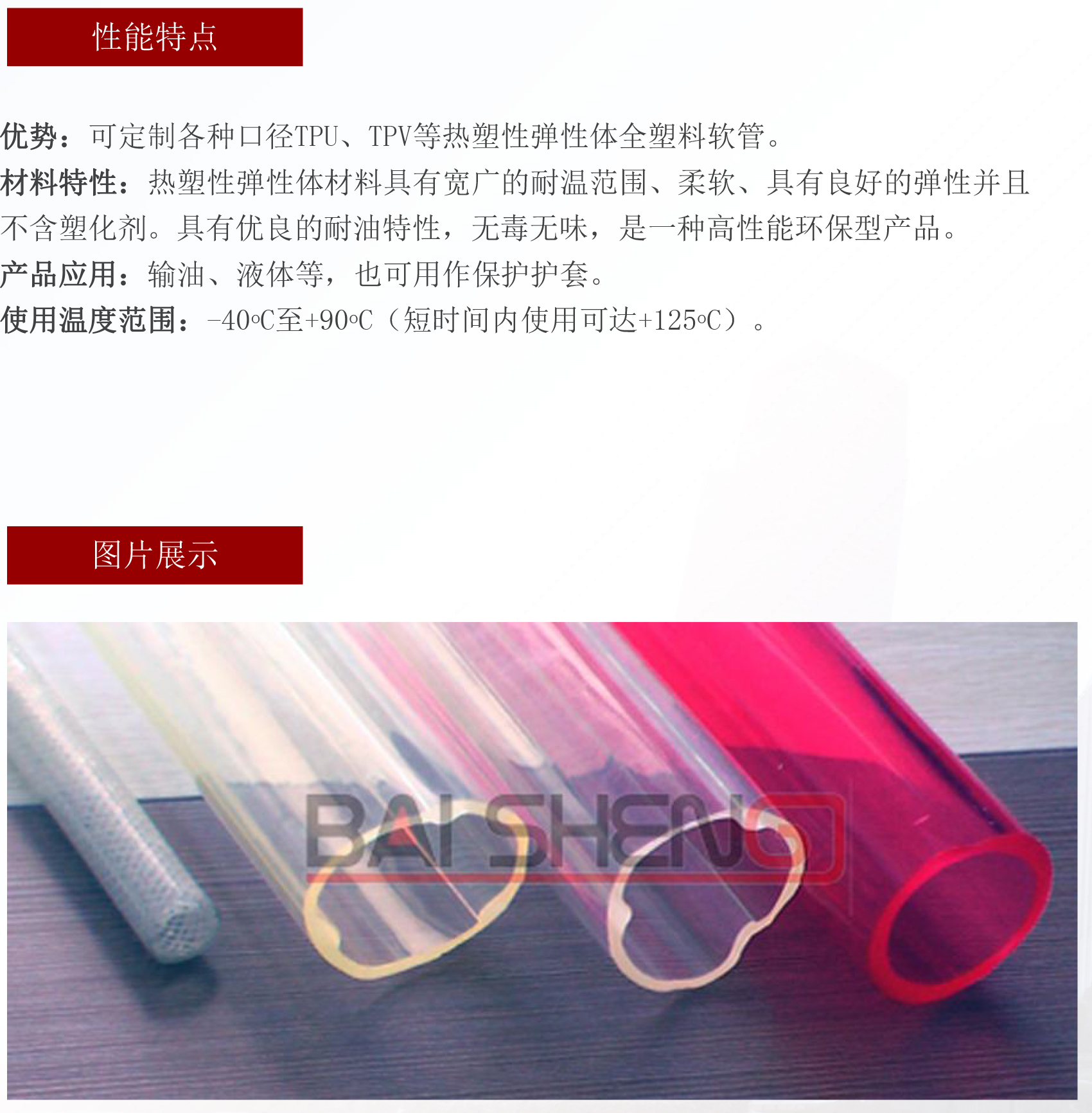 材料特性:熱塑性彈性體材料具有寬廣的耐溫范圍、柔軟、具有很好的彈性并且不含塑化劑,具有好的耐油特性,無毒無味,是一種高性能環(huán)保型產(chǎn)品。產(chǎn)品應(yīng)用:輸油、液體等,也可用作保護護套。