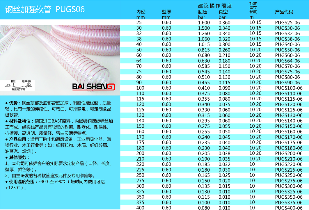 優(yōu) 勢(shì):鋼絲頂部及底部管壁加厚,耐磨性能優(yōu)越,質(zhì)量輕,具有一定的伸縮性、可彎曲、可排靜電,可定制食品級(jí)軟管。