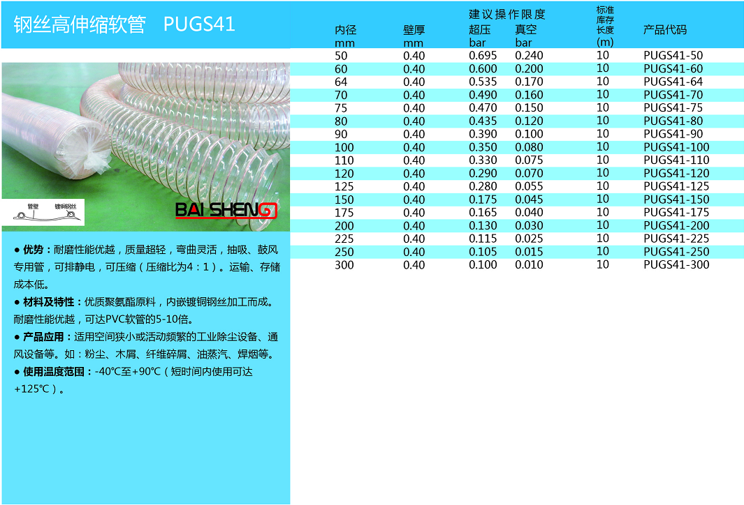 優(yōu) 勢(shì):耐磨性能優(yōu)越,質(zhì)量超輕,彎曲靈活,抽吸、鼓風(fēng)用管,可排靜電,可壓縮(壓縮比4:1)。運(yùn)輸、存儲(chǔ)成本低。